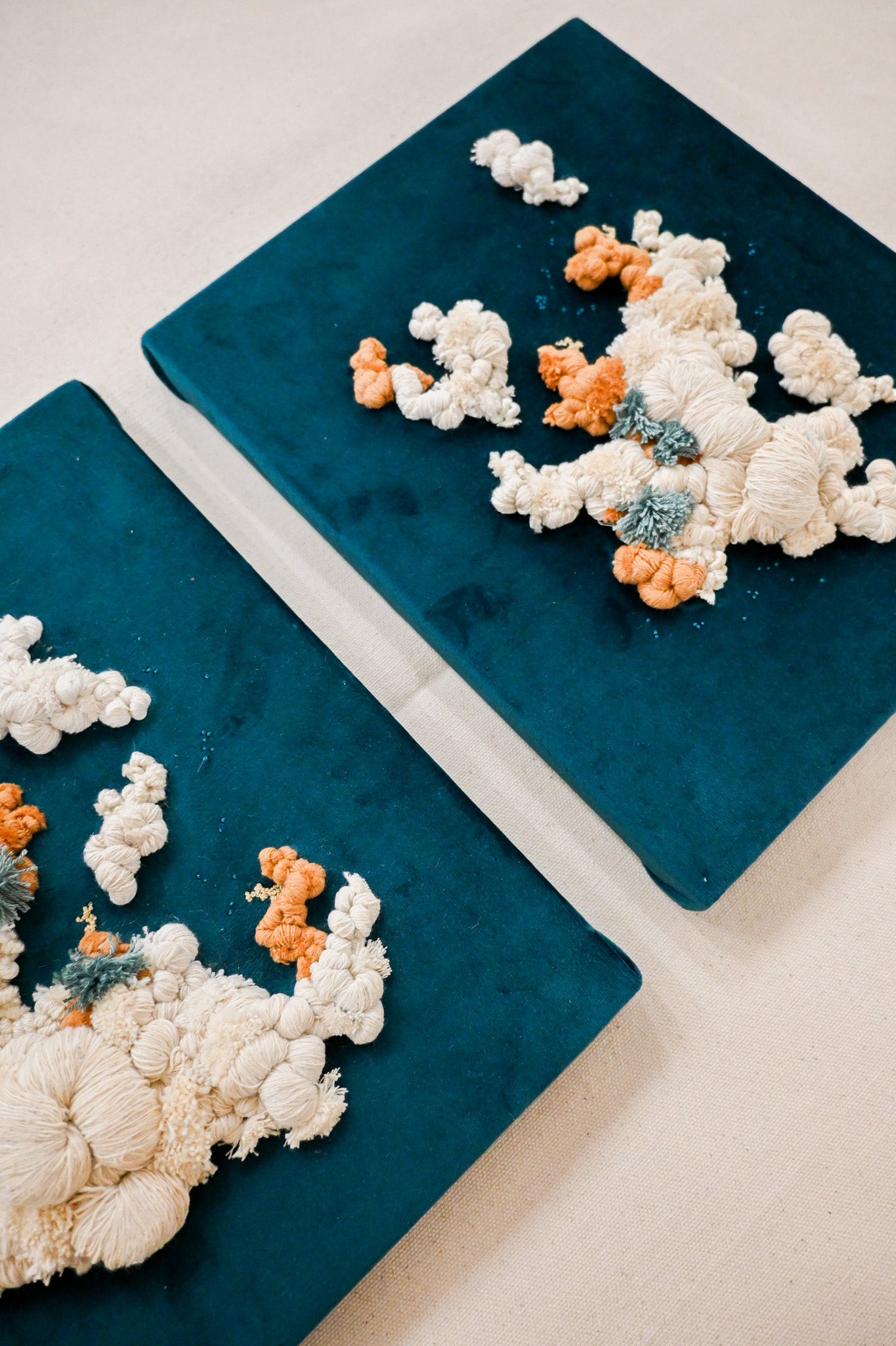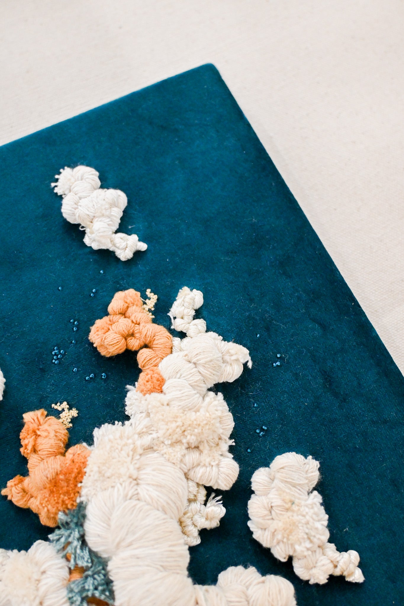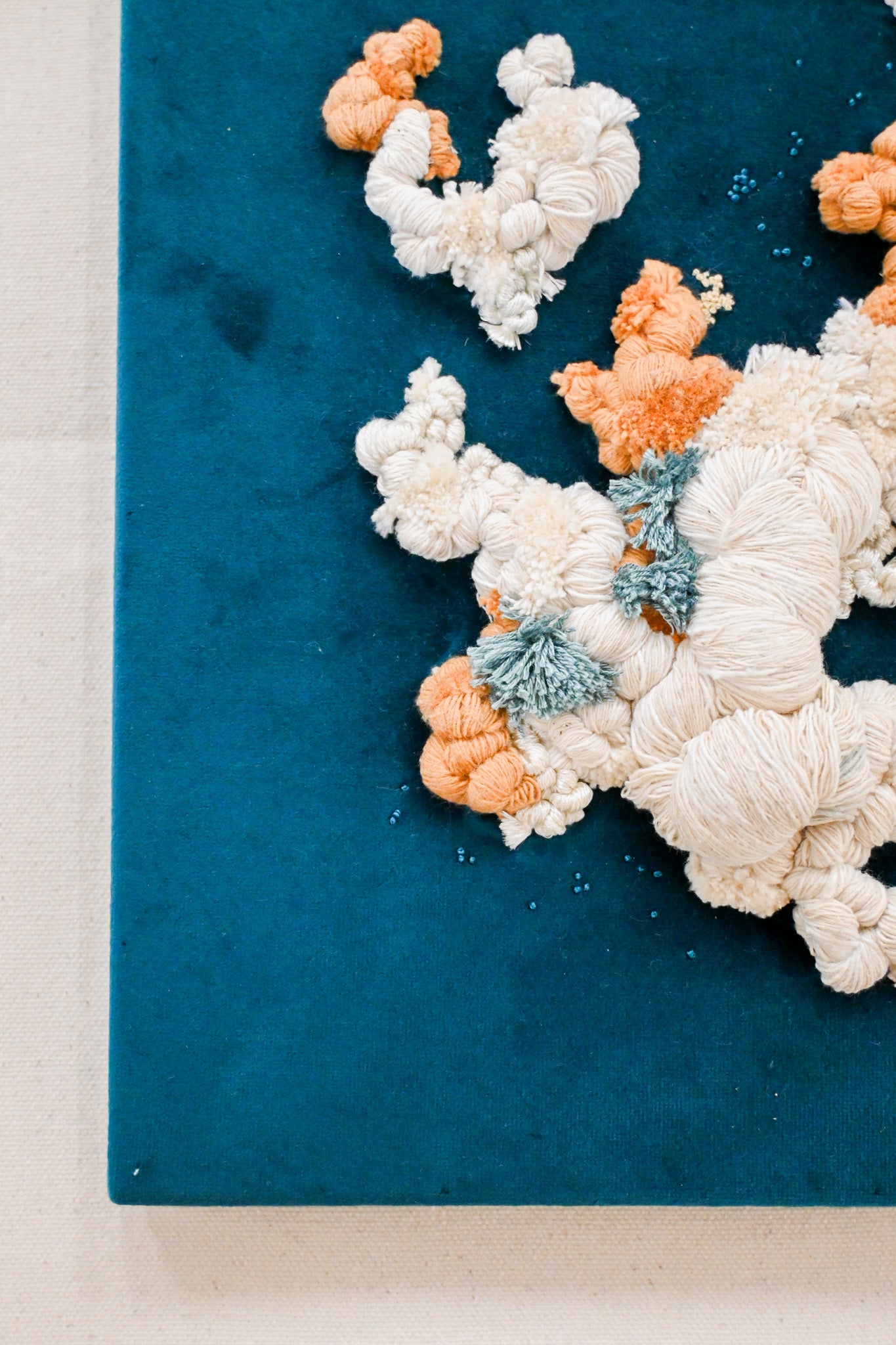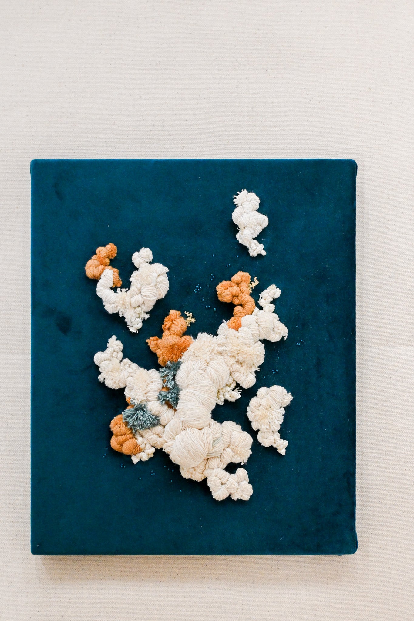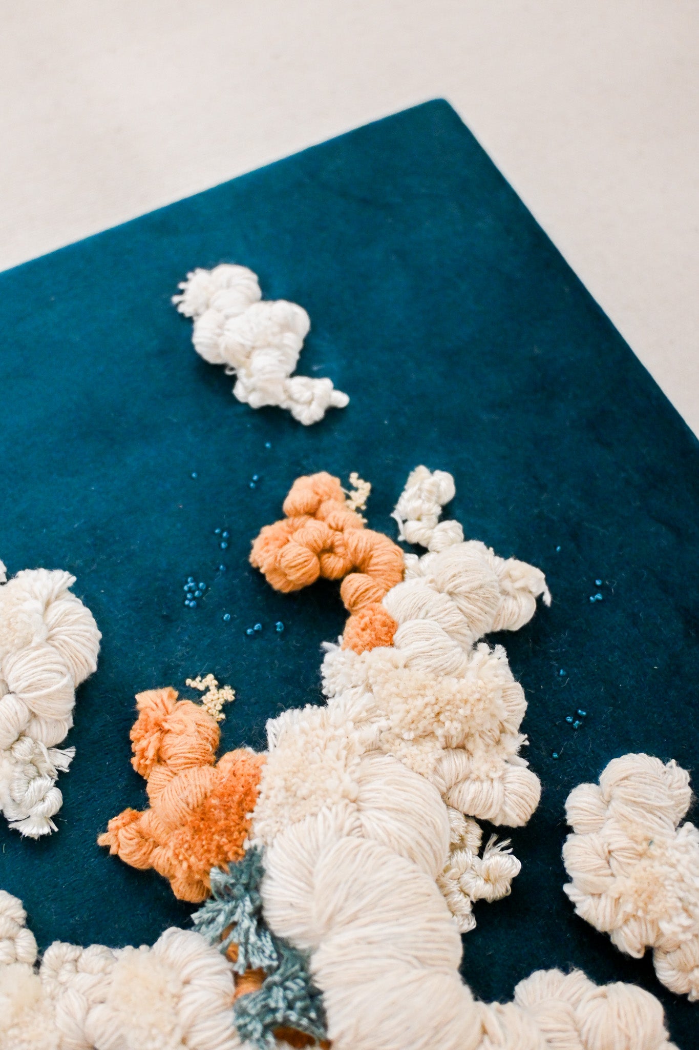 Textile wall piece embroidered over a deep teal velvet background using a variety of cotton threads and fibers. Inspired by the organic beauty of coral formations, this relief composition explores texture, movement, and softness through sculptural stitching.